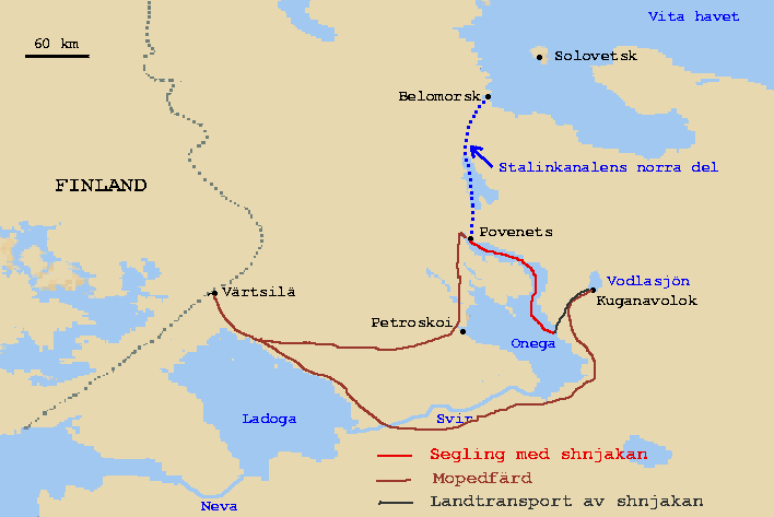 Vid midnatt når vi Povenets och ankrar en bit från Stalinkanalens mynning där den första slussen ligger. Följande dag är den nordvästliga vinden så kraftig att det inte finns möjlighet att komma i land med shnjakan. Vi ror i land med gummijollen. Kontakten med kanalmyndigheterna var just så deprimerande som jag hade väntat mig. Den oregistrerade och obesiktade shnjakan får inte gå in i kanalen och farkoster utan motor och vhf-radio får överhuvudtaget inte röra sig i kanalen. Enda möjligheten är att bli bogserad genom kanalen av ett fartyg av lämplig storlek. Det här förutsätter att det råkar komma ett lämpligt fartyg på väg norrut som dessutom är villigt att ta shnjakan i bogsering. Trafiken i kanalen är numera mycket liten och det kan gå flera dagar utan att en enda båt går in i kanalen. Kanalens betydelse som transportled har minskat allteftersom lastbils- och tågtransporterna har ersatt fartygstransporterna. Jag kan inte undgå att tänka på alla de omkring 100.000 tvångsarbetare som dog under ohyggliga förhållanden och olidligt slit vid byggande av kanalen på 30-talet. Deras liv offrades för en kanal som inte längre behövs! Många tvångsarbetare var oliktänkande som fick välja mellan fängelse och tvångsarbete. Om de valde tvångsarbete blev de lovade amnesti när kanalen blev färdig. Det löftet sveks och när kanalen blev färdig deporterades de överlevande till Sibirien för fortsatt tvångsarbete.