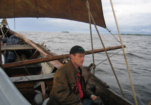 Väl ute på Onega kan vi hissa seglet. Med en akterlig vind mellan 2-4 m/s gör vi 4-5 knop. Båten har en stabil gång bl.a. på grund av den långa kölen. Rodret kan låsas med en finurlig mekanism bestående av hack i roderkulten. Hacken passas in i olika lägen mot en pinne som fixerar roderläget. Mekanismen fungerar bra när man seglar för öppen vind och inte hela tiden behöver korrigera kursen.