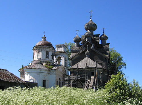 ![]() | Kyrkor i byn Paltoga på Onegas sydoststrand. Man kan se att det görs tappra försök att restaurera kyrkorna, men i brist på medel blir arbetet ofta avbrutet på obestämd tid. |