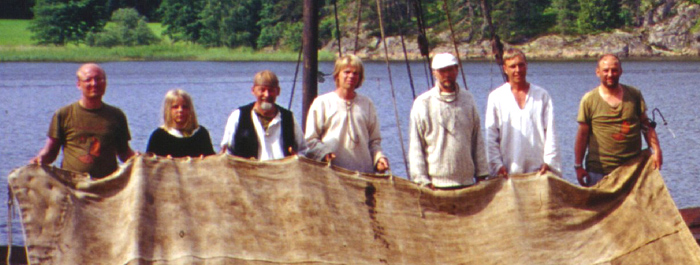 ![]() Vesillelaskun yhteydessä suoritamme rungolle toimenpiteen nimeltä "myrning" (ruots.). Se on vanha tekniikka, jolla vuotava runko tilkitään: Heti vesillelaskun jälkeen ohjataan muurahaispesämateriaalia sisältävä laatikko veneen alle veteen. Sitten avataan laatikon kansi, jolloin kekoaines imeytyy rungon rakoihin ja tilkitsee vuodot. - Se toimii. Laiva vuoti nyt huomattavasti vähemmän kuin edeltävillä vesillelaskuilla. | ![]() Attila (oikealla) lahjoitti meille tämän ominkäsin valmistetun taistelukypärän, jota allekirjoittanut (vas.) tässä kantaa. Taustalla näkyy Viipurin linnoitus. |