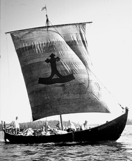 | Enimmäkseen täytyy soutaa, mutta välillä voimme nostaa purjeen. Ennen lähtöä Viipurista ompelimme Rus-projektin logon purjeeseen. Logomme on muinaissuomalainen "Ukkokirves", joka vastaa muinaiskandinaavista Torshammarea. Muutamat mytologit näkevät siinä ylös-alas käänetyn elämänpolun. Suomalainen kirjailija Timo Heikkilä on kirjoittanut kirjan "Ukkokirves", jossa hän käsittelee symbolin mytologiaa. | ![]() |