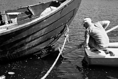 Illalla, kun lounaistuuli on tyyntynyt, soudamme matkoihimme. Vastatuulen vallitessa suosimme soutamista yöllä, kun tuuli on yleisesti hiljaisempi. Yöllä soutaminen on vuorokausirytmin häiriintymisen takia raskasta miehistölle, mutta päiväsaikaan kovassa vastatuulessa emme saapuisi koskaan perille. Torstaina 28.6 klo 3 aamulla soudamme Kotkaan ja rantaudumme Sapokanlahden vierassatamaan. Unta muutama tunti. Saunassa käynti. Radio-, TV- ja lehtihaastattelut tekevät päivästä hektisen. Max ja Aleks onkivat satamasta kalaa ja saavat ämpärillisen särkiä, jotka paistetaan päivälliseksi. Osa särjistä suolataan ja kuivataan. Minä korjaan ruorin.