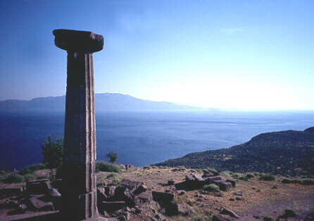 We arrive at 5 am to the small harbour of Assos. Pos N39 30' E26 20'. At the entrance we run aground on the 2500 year old ancient mole. A harmless contact with the pier to which Alexander the Great moored his ships. In Assos we have some problems with the military personel of the harbour but by a phonecall to Kemal, and with his kind help, the situation is taken care of. In the afternoon we walk to the ruins of Assos. Aristotle carried out much of his research on life sciences here. Beatiful scenery from the height of the Temple of Athena (picture to the right).